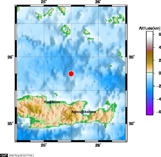 Το ακριβές επίκεντρο τη δόνησης εντοπίζεται στα 59 χλμ. βόρεια - βορειοανατολικά του Ηρακλείου Κρήτης.