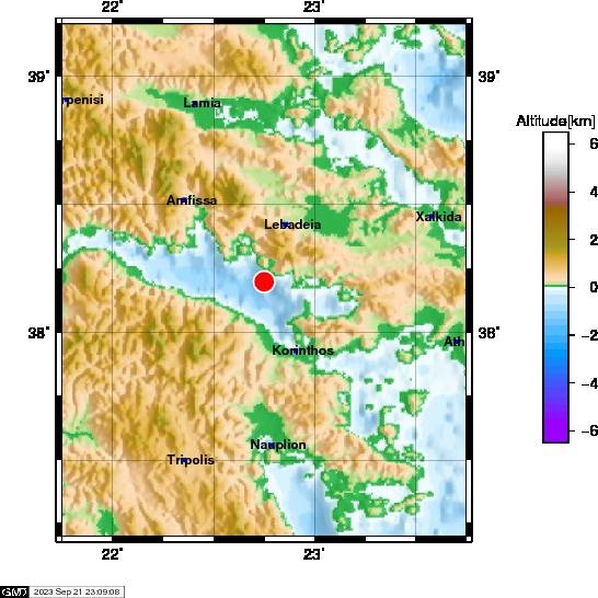 Το ακριβές επίκεντρο τη δόνησης εντοπίζεται στα 20 χλμ. βόρεια του Κιάτου και στα 84 χλμ. δυτικά του Πειραιά.