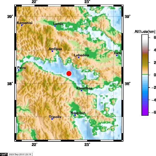 Το ακριβές επίκεντρο τη δόνησης εντοπίζεται στα 21 χλμ. βόρεια του Κιάτου και στα 83 χλμ. δυτικά του Πειραιά.