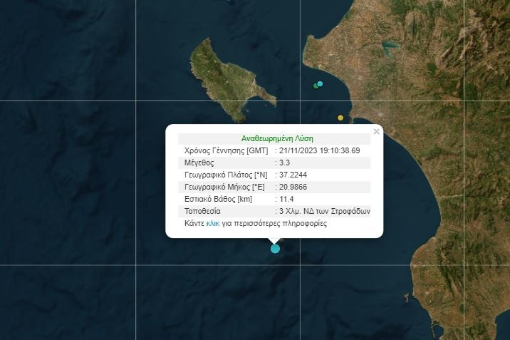 Το εστιακό βάθος του σεισμού εντοπίζεται στα 11,4 χιλιόμετρα και έγινε αισθητός στις Στροφάδες και στις γύρω περιοχές.