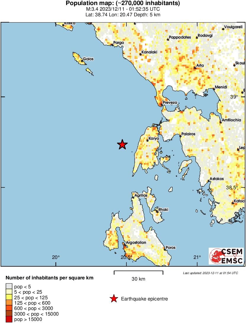 Σεισμός Τώρα: Ασθενής σεισμική δόνηση μεγέθους 3,4 βαθμών της κλίμακας Ρίχτερ, σύμφωνα με την αυτόματη λύση του Ευρωπαϊκού - Μεσογειακού Σεισμολογικού Ινστιτούτου (EMSC), σημειώθηκε τα ξημερώματα της Δευτέρας (11/12), στις 03:52 κοντά στις δυτικές ακτές Λευκάδας.