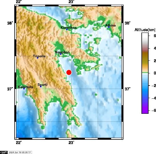 Το επίκεντρο της δόνησης εντοπίζεται στον θαλάσσιο χώρο 16 χλμ. βορειοανατολικά του Λεωνιδίου.