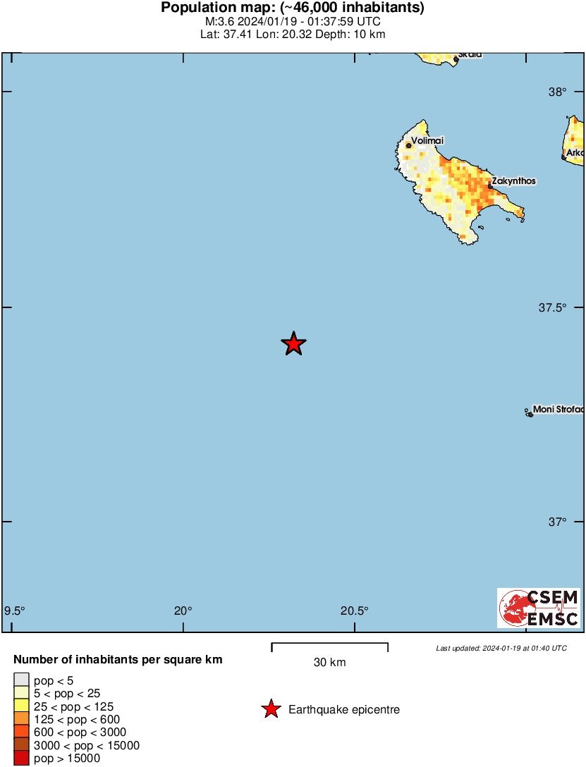 Σεισμός Τώρα - Σεισμός στη Ζάκυνθο - Όλες οι ειδήσεις: Ασθενής σεισμική δόνηση μεγέθους 3,6 βαθμών της κλίμακας Ρίχτερ, σύμφωνα με την αυτόματη προκαταρκτική λύση του Ευρωπαϊκού - Μεσογειακού Σεισμολογικού Ινστιτούτου (EMSC), σημειώθηκε τα ξημερώματα της Παρασκευής (19/1) στις 03:37, σε υποθαλάσσια περιοχή του Ιονίου Πελάγους, νοτιοδυτικά της Ζακύνθου.