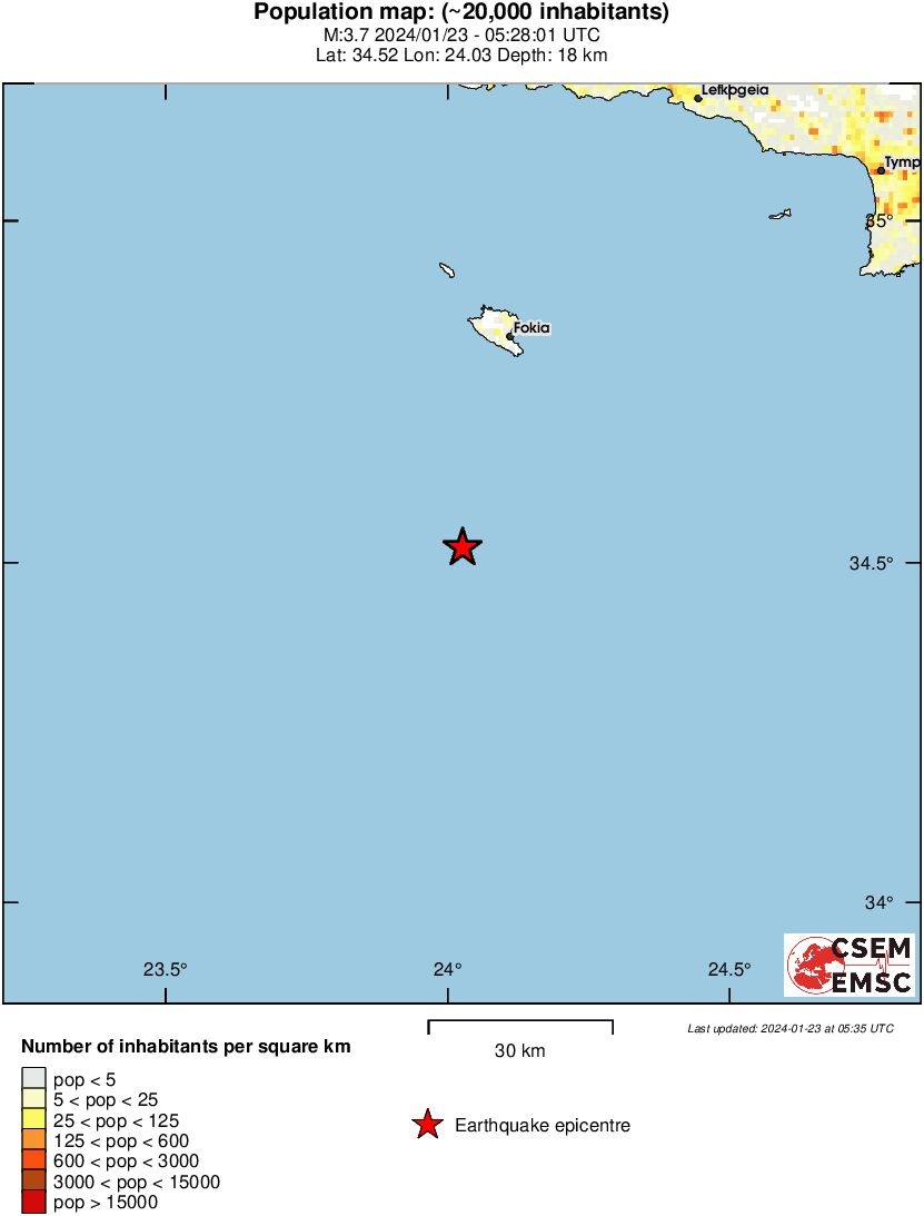 Και η αναθεωρημένη λύση του Γεωδυναμικού Ινστιτούτου του Αστεροσκοπείου Αθηνών δίνει το σεισμό στα 3,7 Ρίχτερ, με εστιακό βάθος τα 18,6 χλμ., και επίκεντρο τα 35 χλμ. νότια της Γαύδου.