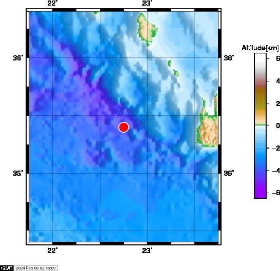 Το ακριβές επίκεντρο τη δόνησης εντοπίζεται στα 87 χλμ. δυτικά - νοτιοδυτικά της Κισσάμου Χανίων.