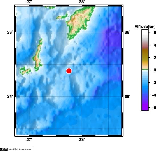 H αναθεωρημένη λύση του Γεωδυναμικού Ινστιτούτου του Αστεροσκοπείου Αθηνών δίνει το σεισμό στα 3,9 Ρίχτερ, με εστιακό βάθος τα 13,5 χλμ., και επίκεντρο τα 48 χλμ. ανατολικά της Καρπάθου.