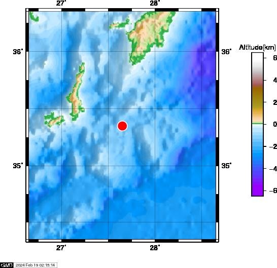 Το ακριβές επίκεντρο της δόνησης εντοπίζεται, 47 χλμ. νοτιοανατολικά της Καρπάθου.