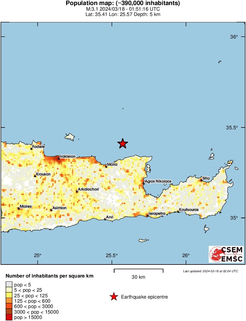 Σεισμός Τώρα: Ασθενής σεισμική δόνηση μεγέθους 3,1 βαθμών της κλίμακας Ρίχτερ, σύμφωνα με την αυτόματη λύση του Ευρωπαϊκού - Μεσογειακού Σεισμολογικού Ινστιτούτου (EMSC), σημειώθηκε στις 03:51 μετά τα μεσάνυχτα (Καθαρά Δευτέρα 18/3), στο Βόρειο Κρητικό Πέλαγος.