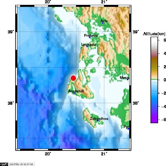 Το ακριβές επίκεντρο τη δόνησης εντοπίζεται στα 19 χλμ. βόρεια - βορειοδυτικά του Αργοστολίου.
