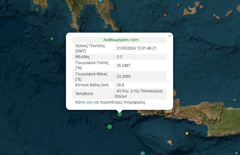 Το επίκεντρο του σεισμού εντοπίζεται 43 χιλιόμετρα δυτικά της Παλαιοχώρας Χανίων