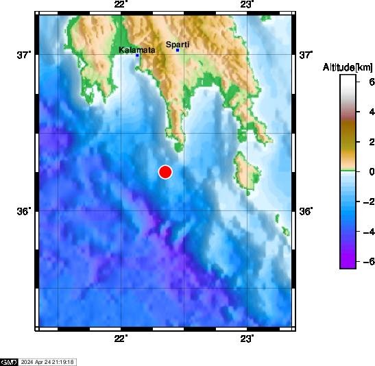 Το ακριβές επίκεντρο της δόνησης εντοπίζεται στα 55 χλμ. νότια του Γυθείου.