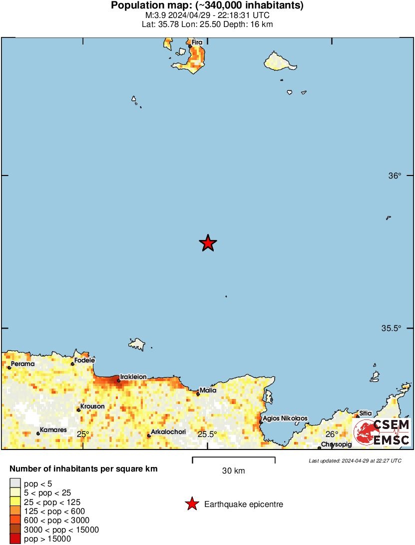 Σύμφωνα με αναφορές στο EMSC, ο νέος σεισμός, όπως και αυτός που σημειώθηκε τα ξημερώματα της Μεγάλης Δευτέρας, έγινε αισθητός σε αρκετές περιοχές στα βόρεια της Κρήτης.