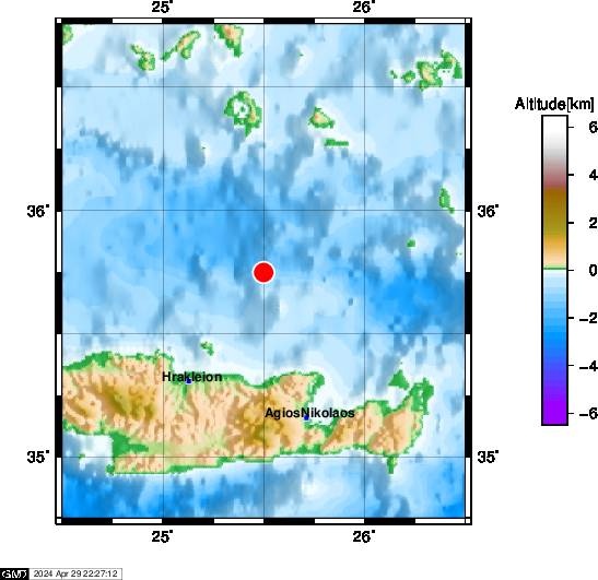 H αναθεωρημένη λύση του Γεωδυναμικού Ινστιτούτου του Αστεροσκοπείου Αθηνών δίνει το σεισμό στα 3,7 Ρίχτερ, με εστιακό βάθος τα 16 χλμ., και επίκεντρο τα 51 χλμ. βόρεια του Ηρακλείου.