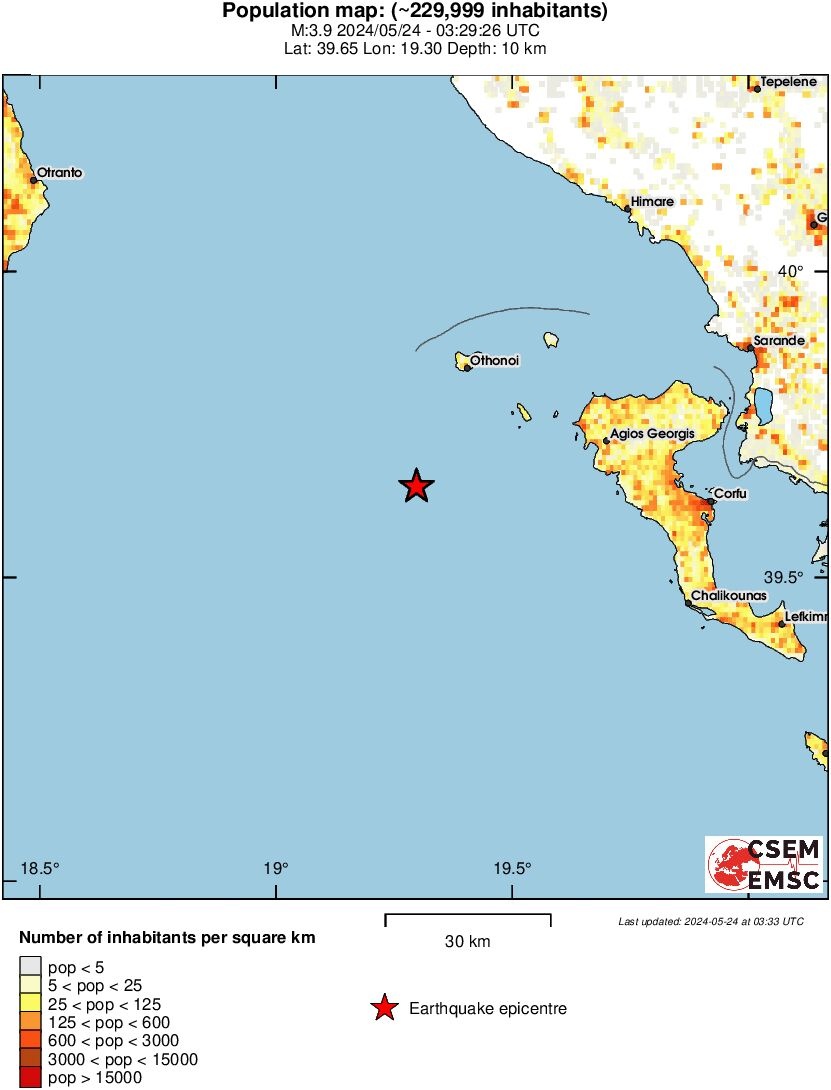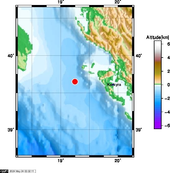 Το ακριβές επίκεντρο της δόνησης εντοπίζεται 64 χλμ. δυτικά από την πόλη της Κέρκυρας σύμφωνα με το EMSC.