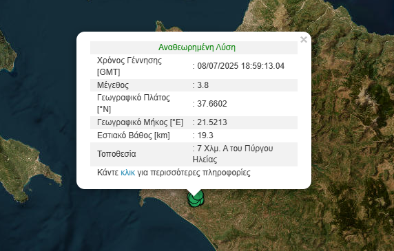 Σεισμός μεγέθους 3,8 της κλίμακας Ρίχτερ σημειώθηκε απόψε (08/07) στον Πύργο Ηλείας.