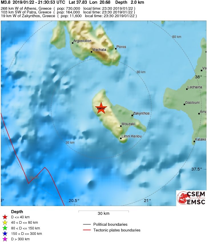 Σεισμός Τώρα - Σεισμός στη Ζάκυνθο - Όλες οι ειδήσεις: Νέα μετασεισμική δόνηση μεγέθους 3,8 βαθμών της κλίμακας Ρίχτερ, σύμφωνα με την προκαταρκτική λύση του Ευρωπαϊκού - Μεσογειακού Σεισμολογικού Ινστιτούτου (EMSC), σημειώθηκε το βράδυ της Τρίτης (22/1), στις 23:30, στη Ζάκυνθο.
