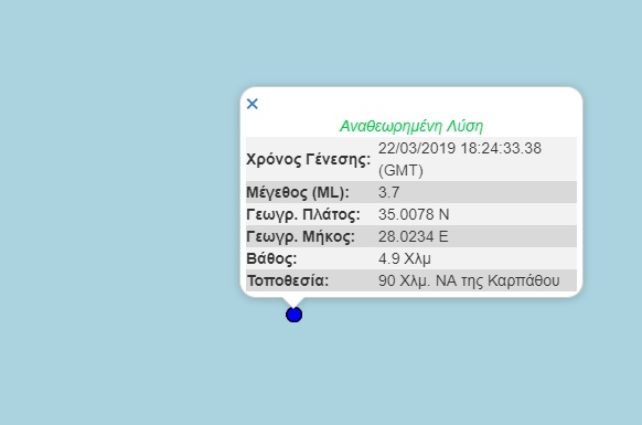 Σεισμός μεγέθους 3,7 βαθμών της κλίμακας ρίχτερ σημειώθηκε στις 20.24 το βράδυ της Παρασκευής (22/03), στη θαλάσσια περιοχή 90 χιλιόμετρα Νοτιοανατολικά της Καρπάθου.