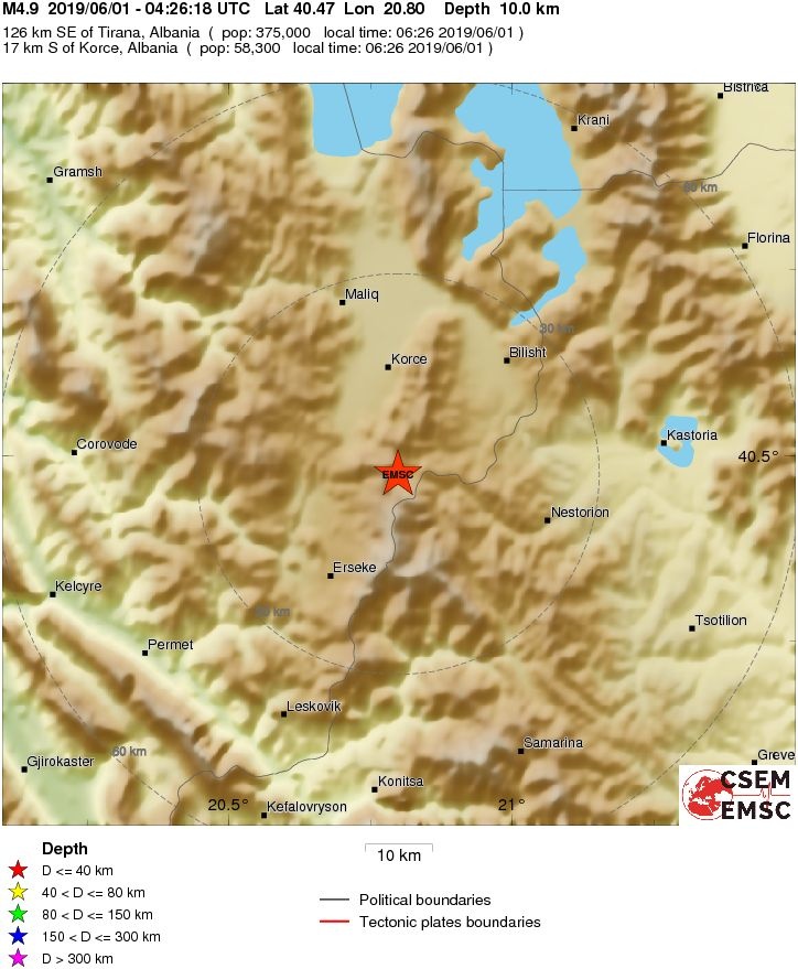 Η προκαταρκτική λύση του Ευρωπαϊκού - Μεσογειακού Σεισμολογικού Ινστιτούτου (EMSC), κατέγραψε στις 07:26, σεισμό μεγέθους 4,9 βαθμών της κλίμακας Ρίχτερ.