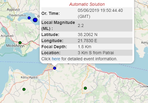 Το επίκεντρο του σεισμού εντοπίστηκε 3χλμ νότια της πόλης της Πάτρας, ενώ το εσταικό βάθος του υπολογίζεται στα 1,8χλμ.