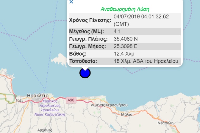 Το επίκεντρο του σεισμού εντοπίστηκε στα 18χλμ βορειοανατολικά της πόλης του Ηρακλείου ενώ το εστιακό βάθος του σεισμού υπολογίζεται σε 12,4χλμ.