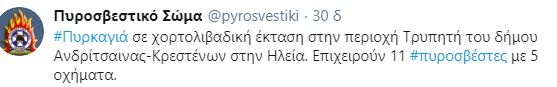 Φωτιά ΤΩΡΑ: Συναγερμός σήμανε σήμερα (30/7/2019) στην Πυροσβεστική Υπηρεσία για πυρκαγιά που ξέσπασε πριν από λίγο, σε αγροτική έκταση στην περιοχή της Τρυπητής του δήμου Ανδρίτσαινας - Κρεστένων.