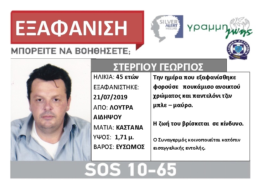 Ο Γεώργιος Στεργίου 45 χρόνων αγνοείται από το βράδυ της Κυριακής 21 Ιουλίου. Σύμφωνα με το anikolouli.gr, γύρω στις 21.00, φιλικά του πρόσωπα τον είδαν να περπατάει μόνος προς το σπίτι του στην Περιφερειακή οδό Λουτρών Αιδηψού.