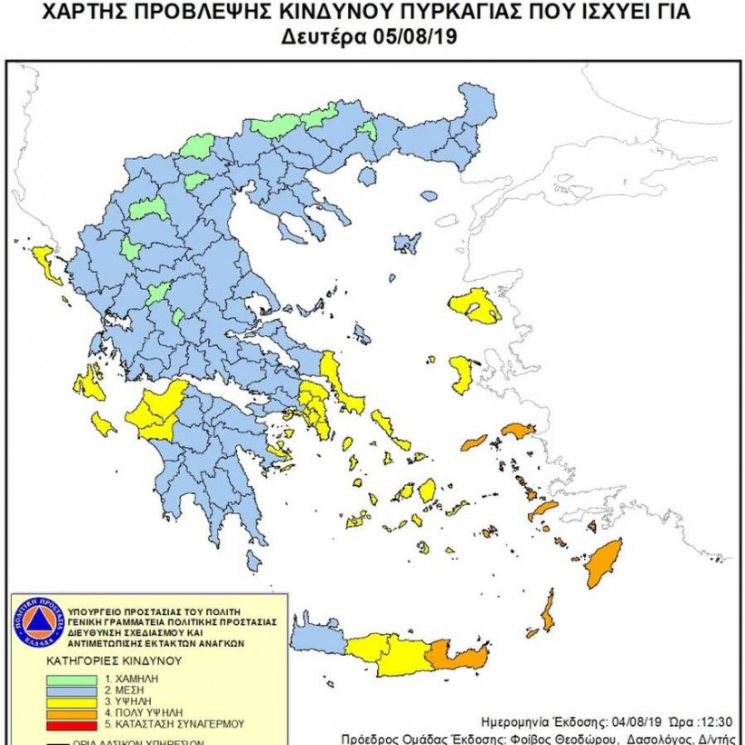 Σύμφωνα με το Χάρτη Πρόβλεψης Κινδύνου Πυρκαγιάς που εκδίδει η Γενική Γραμματεία Πολιτικής Προστασίας του Υπουργείου Προστασίας του Πολίτη (www.civilprotection.gr), για σήμερα Δευτέρα 5 Αυγούστου 2019, προβλέπεται πολύ υψηλός κίνδυνος πυρκαγιάς (κατηγορία κινδύνου 4) για τις εξής περιοχές: