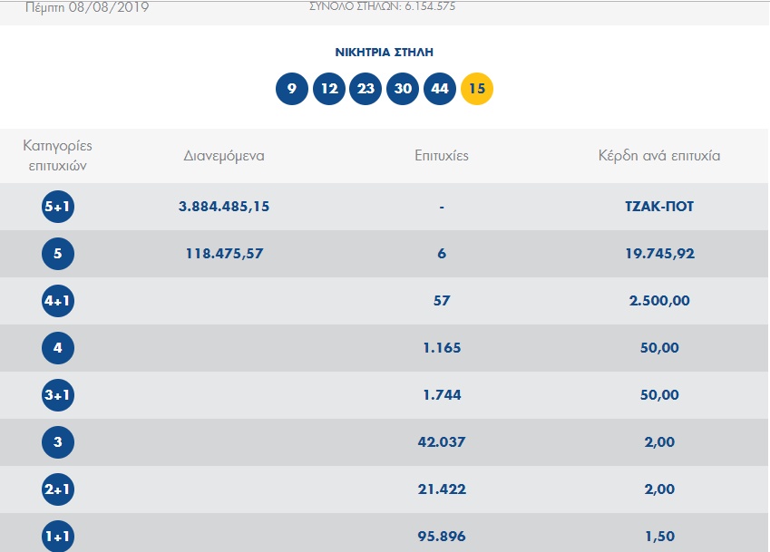 Τζόκερ: Τζακ ποτ σημειώθηκε στην αποψινή (8/8/2019) κλήρωση.