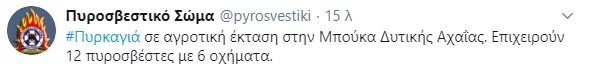Από την πλευρά του, ο δήμαρχος Δυτικής Αχαΐας, Χρήστος Νικολάου, δήλωσε στο ΑΠΕ-ΜΠΕ ότι ήταν άμεση η βοήθεια του που παρείχε ο δήμος στην Πυροσβεστική Υπηρεσία, ειδικά στο μέτωπο της φωτιάς στην περιοχή Μπούκα.
