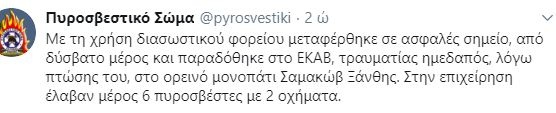 Συνολικά έξι πυροσβέστες με 2 οχήματα συμμετείχαν στην επιχείρηση διάσωσης ενώ με τη χρήση διασωστικού φορείου ο άνδρας μεταφέρθηκε σε ασφαλές σημείο και παραδόθηκε στο ΕΚΑΒ, το οποίο τον μετέφερε στο Γενικό Νοσοκομείο Ξάνθης.