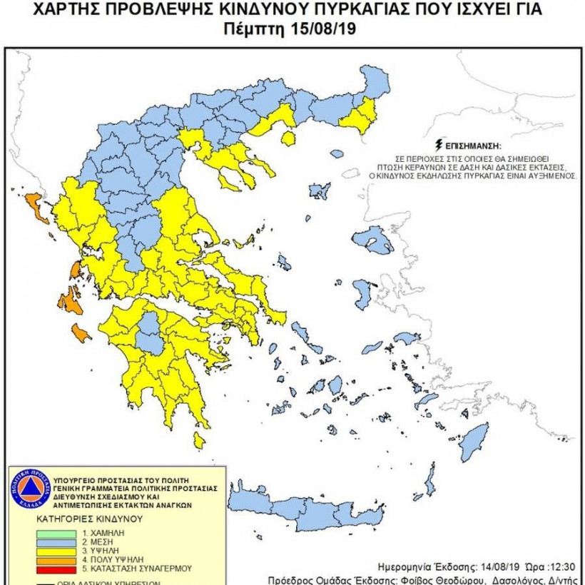 Σύμφωνα με το Χάρτη Πρόβλεψης Κινδύνου Πυρκαγιάς που εκδίδει η Γενική Γραμματεία Πολιτικής Προστασίας του Υπουργείου Προστασίας του Πολίτη (www.civilprotection.gr), για σήμερα Πέμπτη 15 Αυγούστου 2019, προβλέπεται πολύ υψηλός κίνδυνος πυρκαγιάς (κατηγορία κινδύνου 4) για τις εξής περιοχές: