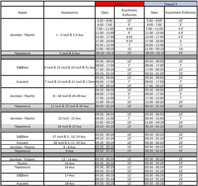 Από Πέμπτη 15 έως και Κυριακή 18 Αυγούστου γίνονται δρομολόγια ανά 12,5 λεπτά. Από τις 19 Αυγούστου έως τις 25 Αυγούστου τα δρομολόγια θα πραγματοποιούνται ανά 10,5 λεπτά.