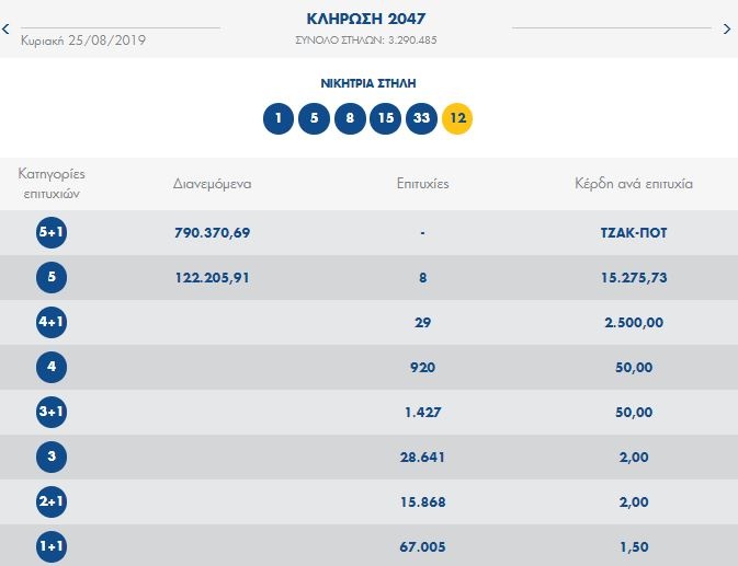 Υπενθυμίζεται ότι οι τυχεροί αριθμοί που κληρώθηκαν στην κλήρωση της Κυραικής ήταν οι: 1, 5, 8, 15, 33 και Τζόκερ ο αριθμός 12.