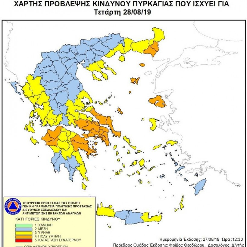Σύμφωνα με το Χάρτη Πρόβλεψης Κινδύνου Πυρκαγιάς που εκδίδει η Γενική Γραμματεία Πολιτικής Προστασίας του Υπουργείου Προστασίας του Πολίτη (www.civilprotection.gr), για σήμερα Τετάρτη 28 Αυγούστου 2019, προβλέπεται πολύ υψηλός κίνδυνος πυρκαγιάς (κατηγορία κινδύνου 4) για την Αττική, τη Βοιωτία, την Εύβοια, τη Σκύρο, τον Έβρο, τη Σαμοθράκη, τη Λήμνο, τη Μυτιλήνη, την Αργολίδα, την Κορινθία, την Αχαΐα και την Ηλεία.