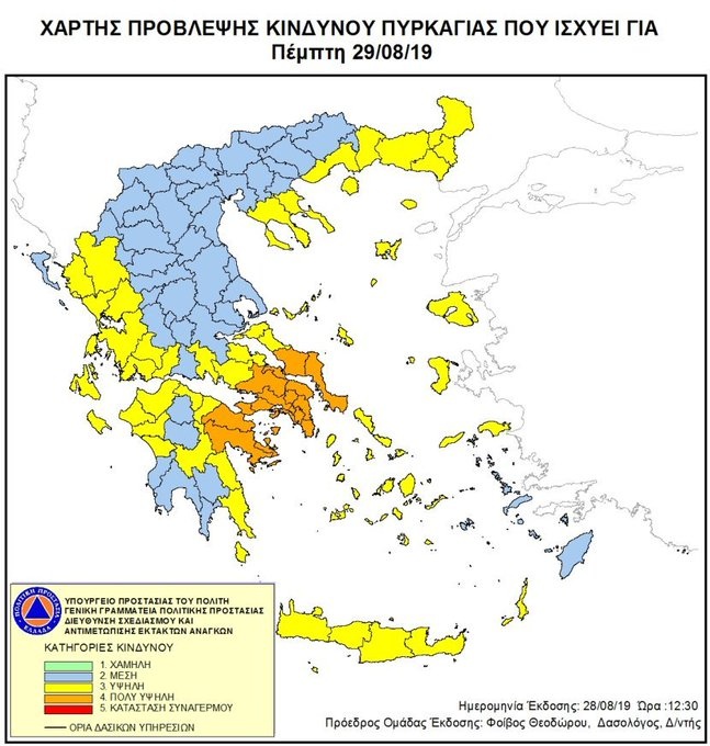 Για ακόμη μια ημέρα, αύριο Πέμπτη (29/08), παραμένει πολύ υψηλός ο κίνδυνος πυρκαγιάς σε τρεις περιφέρειες της Ελλάδας, σύμφωνα με τον χάρτη πρόβλεψης που εκδίδει η Γενική Γραμματεία Πολιτικής Προστασίας.