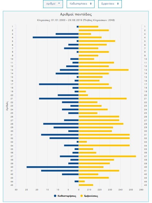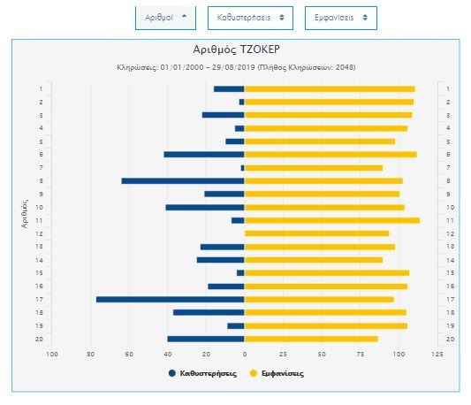 Δείτε ΕΔΩ αναλυτικά τα στατιστικά του ΟΠΑΠ με τις εμφανίσεις και τις καθυστερήσεις των τυχερών αριθμών στο Τζόκερ. Μπορείτε να δείτε τους τυχερούς αριθμούς των κληρώσεων μέχρι και τις 29/08/2019, σύμφωνα με την επίσημη ιστοσελίδα του ΟΠΑΠ.