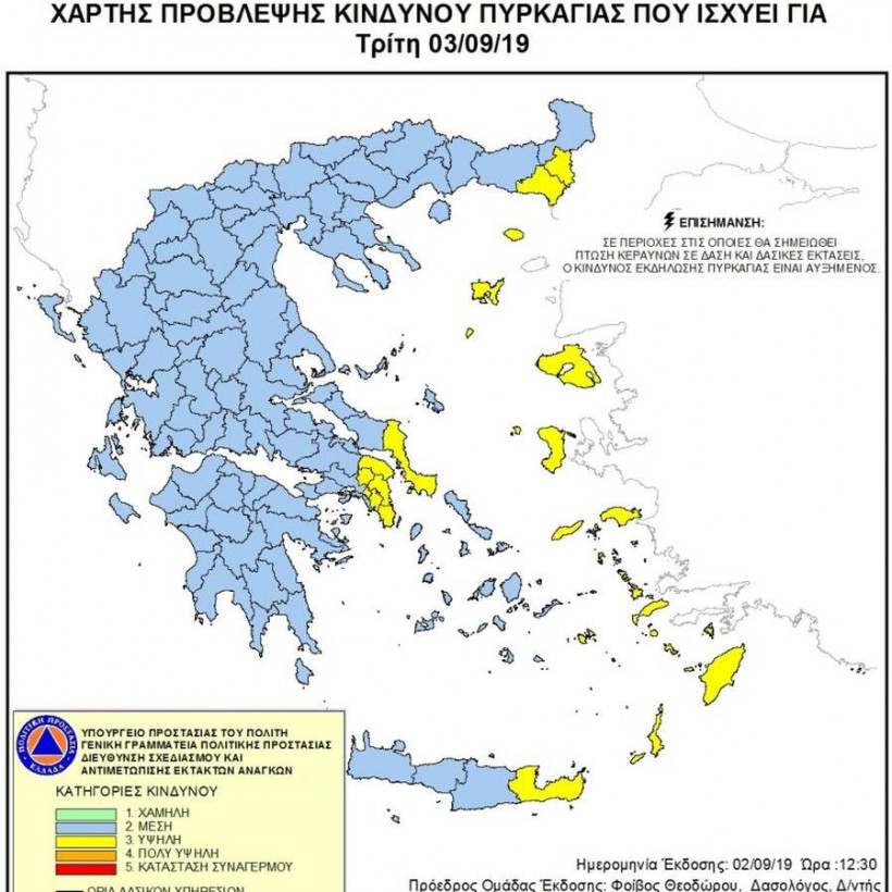 Σύμφωνα με το Χάρτη Πρόβλεψης Κινδύνου Πυρκαγιάς που εκδίδει η Γενική Γραμματεία Πολιτικής Προστασίας του Υπουργείου Εσωτερικών και Διοικητικής Ανασυγκρότησης, για σήμερα Τρίτη, 3 Σεπτεμβρίου, προβλέπεται υψηλός κίνδυνος πυρκαγιάς (κατηγορία κινδύνου 3), σε ορισμένες περιοχές της Ελλάδας.