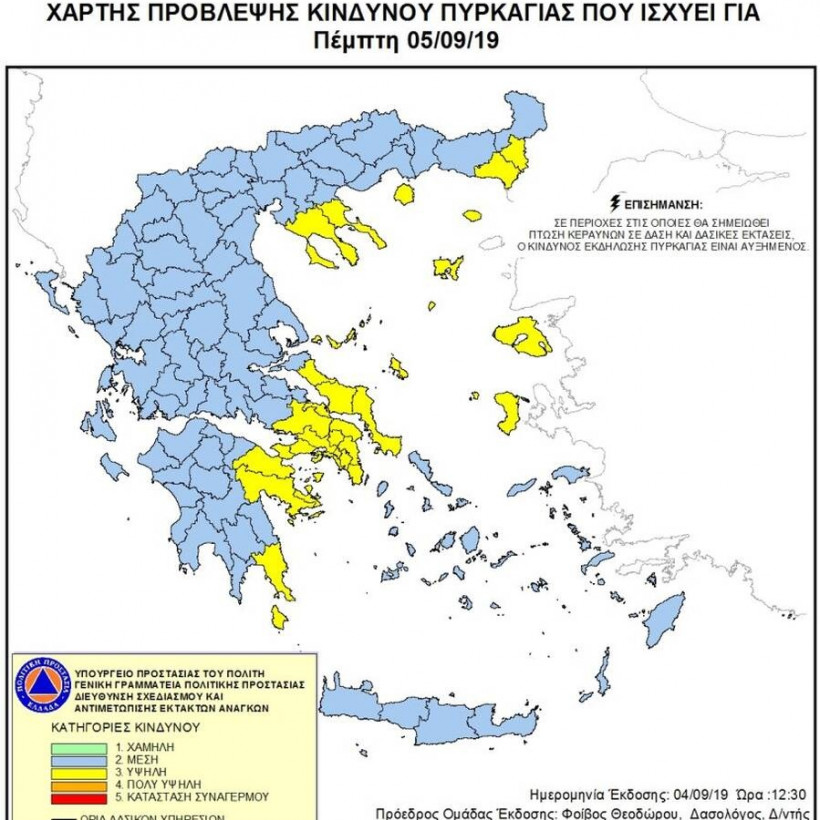 Σύμφωνα με το Χάρτη Πρόβλεψης Κινδύνου Πυρκαγιάς που εκδίδει η Γενική Γραμματεία Πολιτικής Προστασίας του Υπουργείου Εσωτερικών και Διοικητικής Ανασυγκρότησης, για σήμερα Πέμπτη, 5 Σεπτεμβρίου, προβλέπεται υψηλός κίνδυνος πυρκαγιάς (κατηγορία κινδύνου 3), σε ορισμένες περιοχές της Ελλάδας.