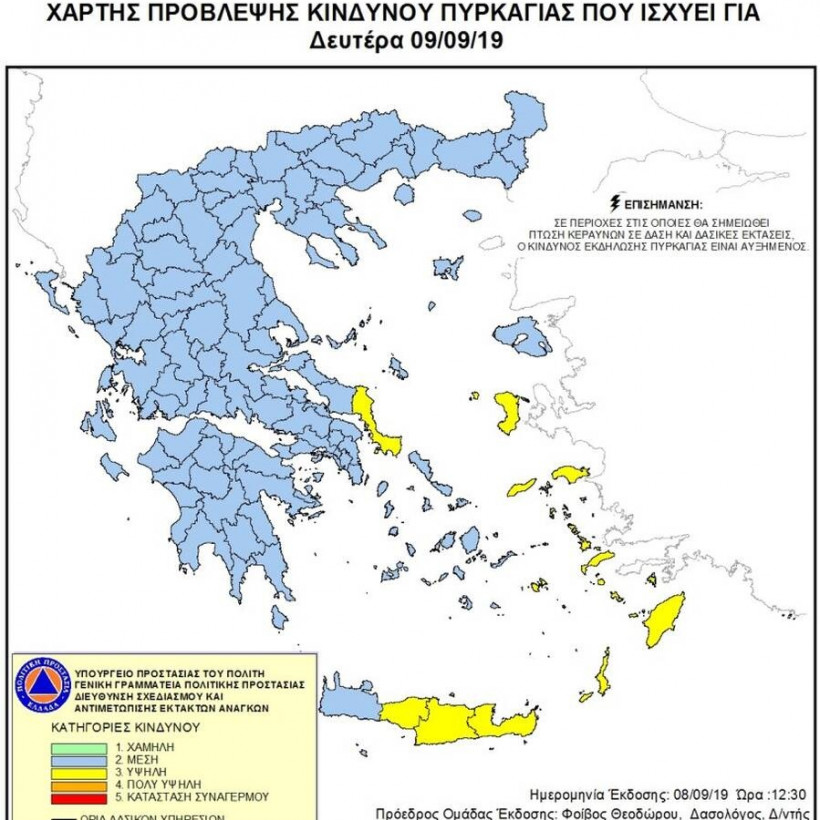 Σύμφωνα με το Χάρτη Πρόβλεψης Κινδύνου Πυρκαγιάς που εκδίδει η Γενική Γραμματεία Πολιτικής Προστασίας του Υπουργείου Εσωτερικών και Διοικητικής Ανασυγκρότησης, για σήμερα Δευτέρα, 9 Σεπτεμβρίου, προβλέπεται υψηλός κίνδυνος πυρκαγιάς (κατηγορία κινδύνου 3), σε ορισμένες περιοχές της Ελλάδας.