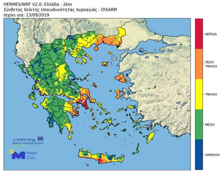 Οι θυελλώδεις άνεμοι, αυξάνουν τον κίνδυνο δημιουργίας και εξάπλωσης πυρκαγιάς, στα νησιά του Αιγαίου και τα ανατολικά ηπειρωτικά τμήματα. Στον επόμενο χάρτη, παρουσιάζεται ο δείκτης επικινδυνότητας πυρκαγιάς για σήμερα Παρασκευή 13/09. Οι περιοχές όπου παρουσιάζουν πολύ υψηλή έως ακραία επικινδυνότητα, είναι η Αττική, η Κεντρική και Νότια Εύβοια, τα νησιά του Βορείου και Ανατολικού Αιγαίου, η Νότια Κρήτη, η Βορειοανατολική Πελοπόννησος και τοπικά περιοχές της Θράκης και της Ανατολικής Μακεδονίας.