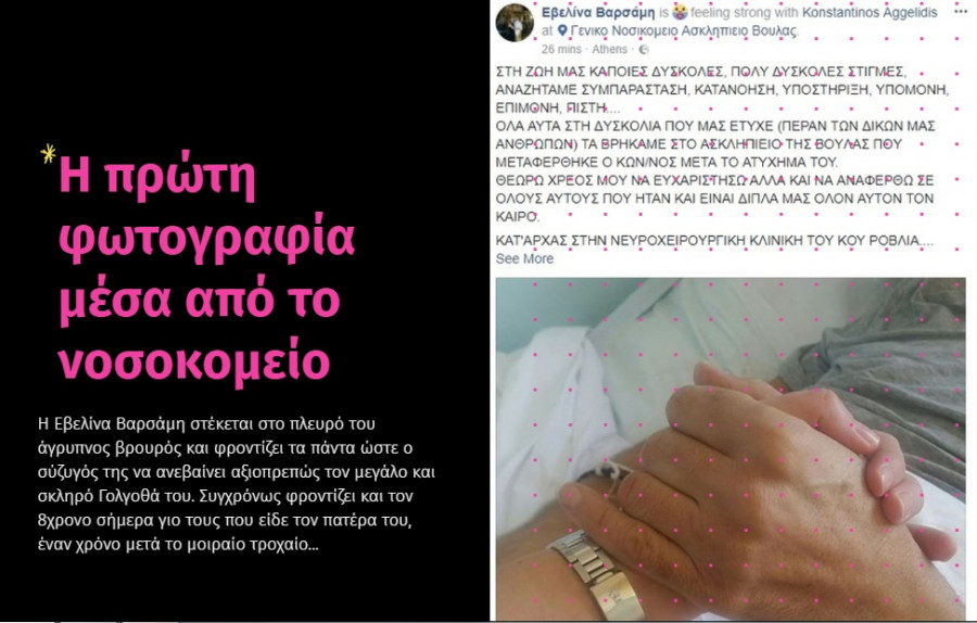 Να βρεθεί κοντά στη σύζυγό του και τον 6χρονο γιο τους για να γιορτάσουν ως οικογένεια την επόμενη ημέρα. Όμως δεν επιστρέφει ποτέ! Ειδοποιούν την Εβελίνα Βαρσάμη πως κάτι σοβαρό έχει συμβεί στον σύζυγό της και τρέχει να κοντά του να δει τι συμβαίνει. Ατύχημα με τη μηχανή, της λένε. Όσο περνάει η ώρα όμως και μαθαίνει από τους θεράποντες γιατρούς του πως κάτι δεν πάει καλά, αρχίζει να ανησυχεί. Δύο μέρες μετά έρχονται και τα χειρότερα νέα που θα μπορούσε να ακούσει. Το χτύπημα είναι σοβαρό και είναι κυρίως στο κεφάλι.
