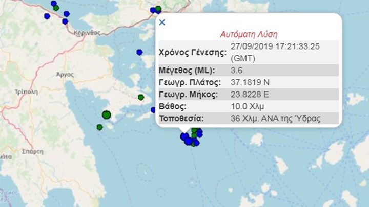 Σεισμός ΤΩΡΑ- Ειδήσεις: Σεισμική δόνηση μεγέθους 3,6 Ρίχτερ σημειώθηκε το βράδυ της Παρασκευής (27/9/2019) ανατολικά της Ύδρας.