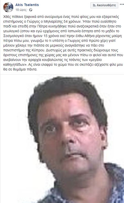 Σε ηλικία μόλις 54 ετών έφυγε από τη ζωή ο καθηγητής Γιώργος Μηλιαρέσης.