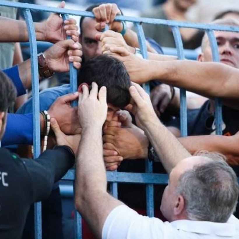 Κάποια στιγμή, λίγο μετά το 60ο λεπτό του ματς, ωστόσο, αντιλήφθηκε ότι το κεφάλι του είχε σφηνώσει ανάμεσα στα κάγκελα και δεν μπορούσε να απεγκλωβιστεί με τίποτα.