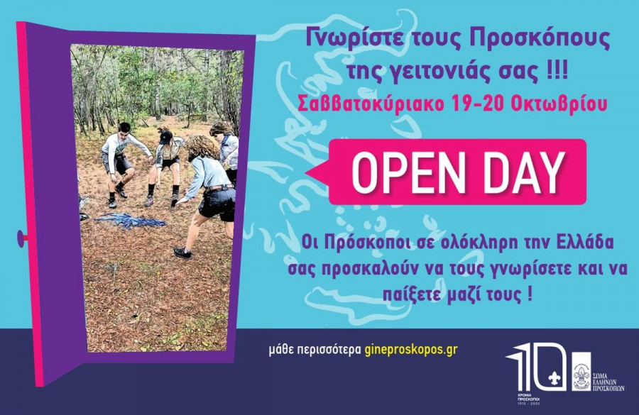 Οι Έλληνες Πρόσκοποι διοργανώνουν πανελλήνιο Open Day, με τίτλο «Γνωρίστε τους Προσκόπους της Γειτονιάς σας» το Σαββατοκύριακο 19-20 Οκτωβρίου 2019 και προσκαλούν κάθε ενδιαφερόμενο να γνωρίσει τη δράση και τα προγράμματα της μεγαλύτερης κίνησης για νέους στην πατρίδα μας και παγκόσμια.