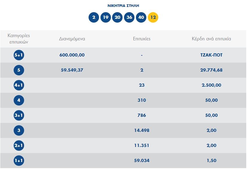 Οι τυχεροί αριθμοί που έβγαλε η κληρωτίδα της αποψινής κλήρωσης είναι οι: 2, 19, 20, 36, 40 και Τζόκερ ο αριθμός 12.