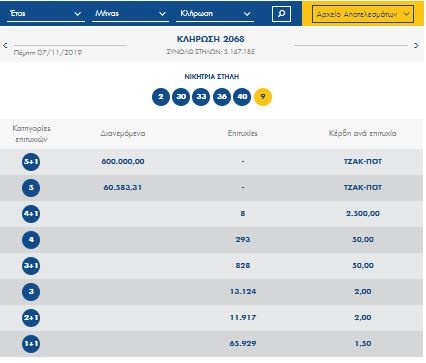 Μπορείτε να δείτε τους τυχερούς αριθμούς των κληρώσεων μέχρι και τις 07/11/2019, σύμφωνα με την επίσημη ιστοσελίδα του ΟΠΑΠ.