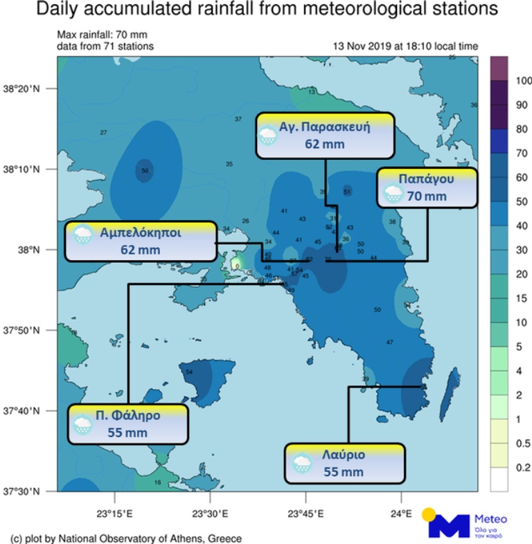 Η «Βικτώρια», επηρεάζει και την Αττική με βροχές και τοπικές καταιγίδες, δίνοντας μεγάλα ύψη βροχής, όπως διακρίνεται και στον παρακάτω Χάρτη. Σύμφωνα με τις καταγραφές των μετεωρολογικών σταθμών του Μετεωρολογικού και Κλιματικού Παρατηρητηρίου Αττικής του Εθνικού Αστεροσκοπείου Αθηνών / meteo.gr, τα μεγαλύτερα ύψη βροχής έως τις περίπου τις 18:10 της Τετάρτης 13/11, να καταγράφονται στην περιοχή του Παπάγου, με 70 mm βροχής.