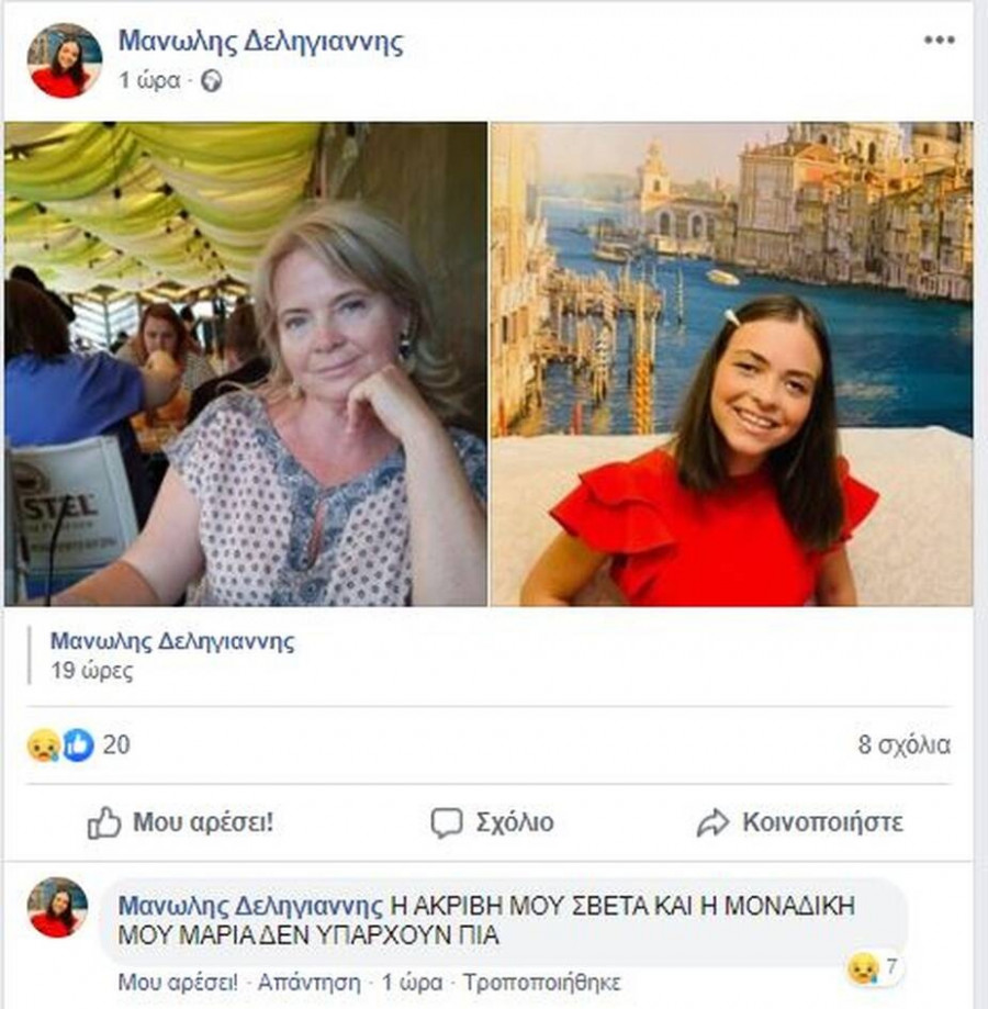 Συντετριμμένος ο πατέρας και σύζυγος, ανέβασε στην προσωπική του σελίδα στο Facebook τις φωτογραφίες των δύο γυναικών, γράφοντας: «Η ακριβή μου Σβέτα και η μοναδική μου Μαρία δεν υπάρχουν πια».