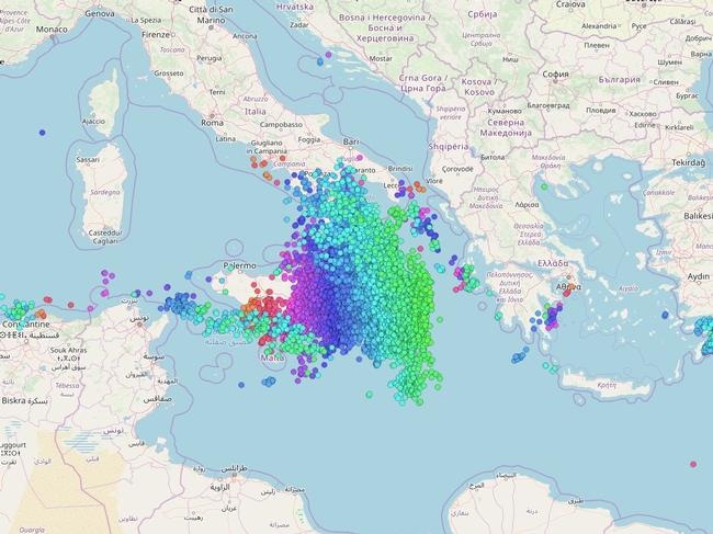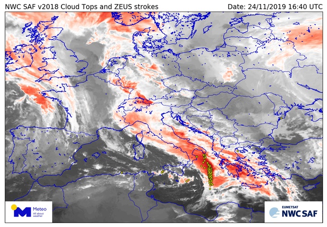 Στη δορυφορική εικόνα αποτυπώνονται επίσης οι περιοχές εκδήλωσης καταιγίδων (με κίτρινους αστερίσκους). Το μέτωπο αυτό παρουσιάζει έντονη ηλεκτρική δραστηριότητα έχοντας δώσει μέχρι τις 19:30 σχεδόν 15.000 κεραυνούς σύμφωνα με το σύστημα ανίχνευσης κεραυνών «ΖΕΥΣ», όπως φαίνεται στον ακόλουθο χάρτη.